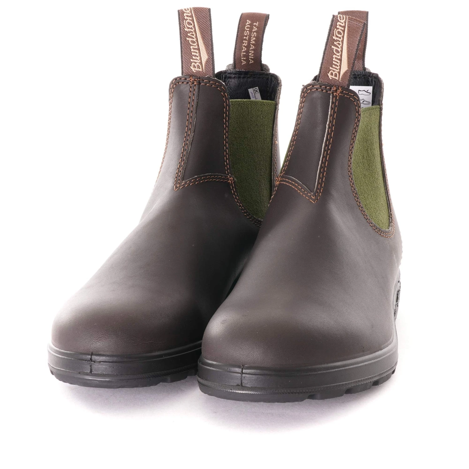 The #519 distinctive olive green elastic side panels are set against dark brown leather uppers. The anatomically shaped PU midsole is designed for comfort, while the TPU outsoles are hard-wearing and provide stability. The removable and replaceable EVA footbeds add extra comfort. The #519 combines Blundstone practicality with contemporary looks.