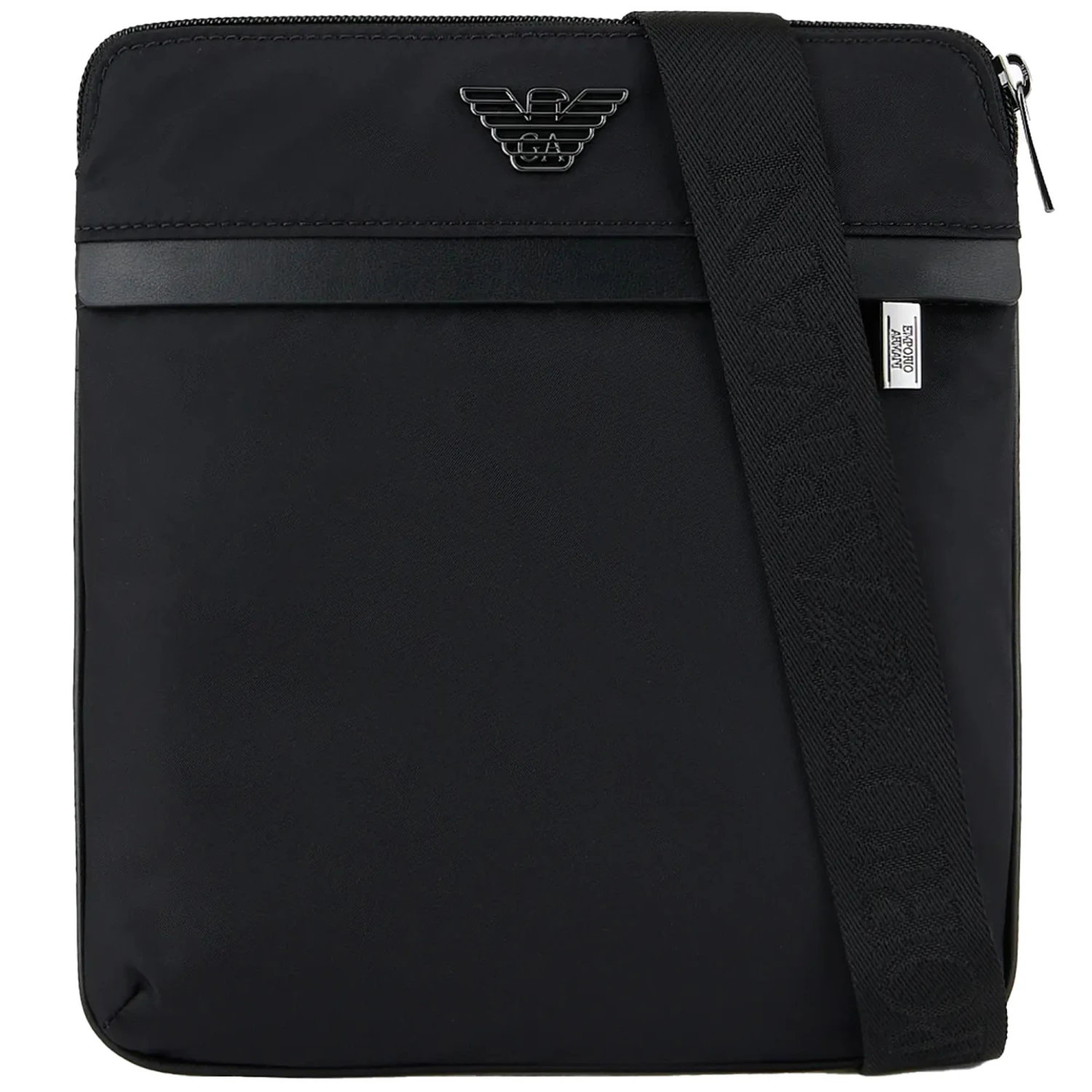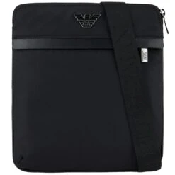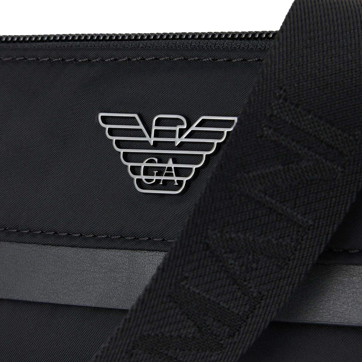 A family of accessories showcasing the brand’s eco-sustainable and environmentally-friendly journey over the past several seasons. Defined by a modern, linear design and urban allure, this line of items is made from recycled nylon with regenerated-leather details. Flat crossbody bag with zip closure and outer zipped compartment. Adjustable logo shoulder strap. Moulded metallic eagle logo. Measurements: 22 x 23 x 4 cm.