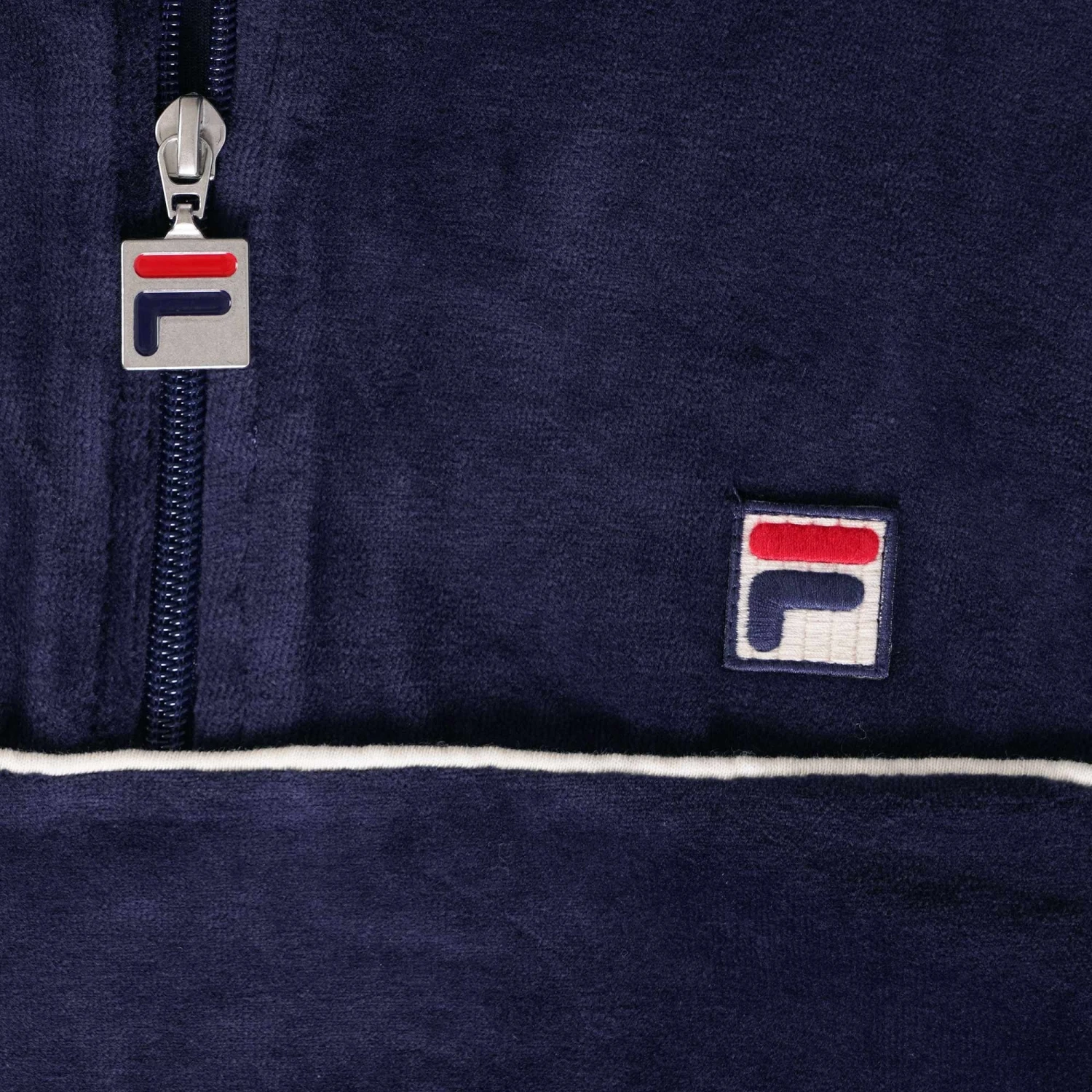 Fila Navy Vintage Duke Half Zip Sweatshirt An allover velour fabric pattern with a stand up collar and a half branded zip closing at the neck. Long sleeves with ribbed cuffs, a stretch ribbed waistline, and a kangaroo type pocket on the waist. A white woven trim runs down the sleeves and over the chest, with the distinctive Fila F logo patch embroidered in red, navy, and cream across the chest.