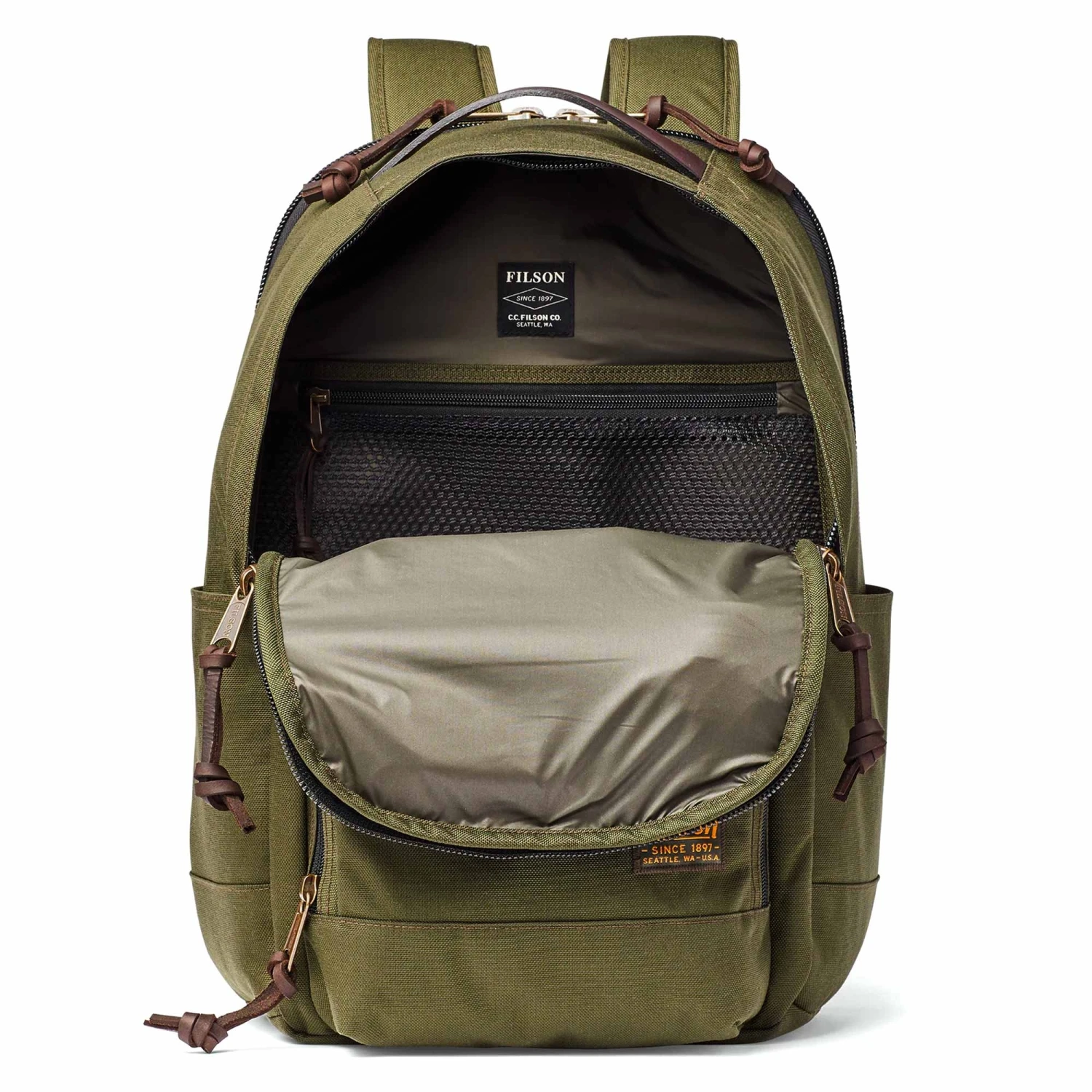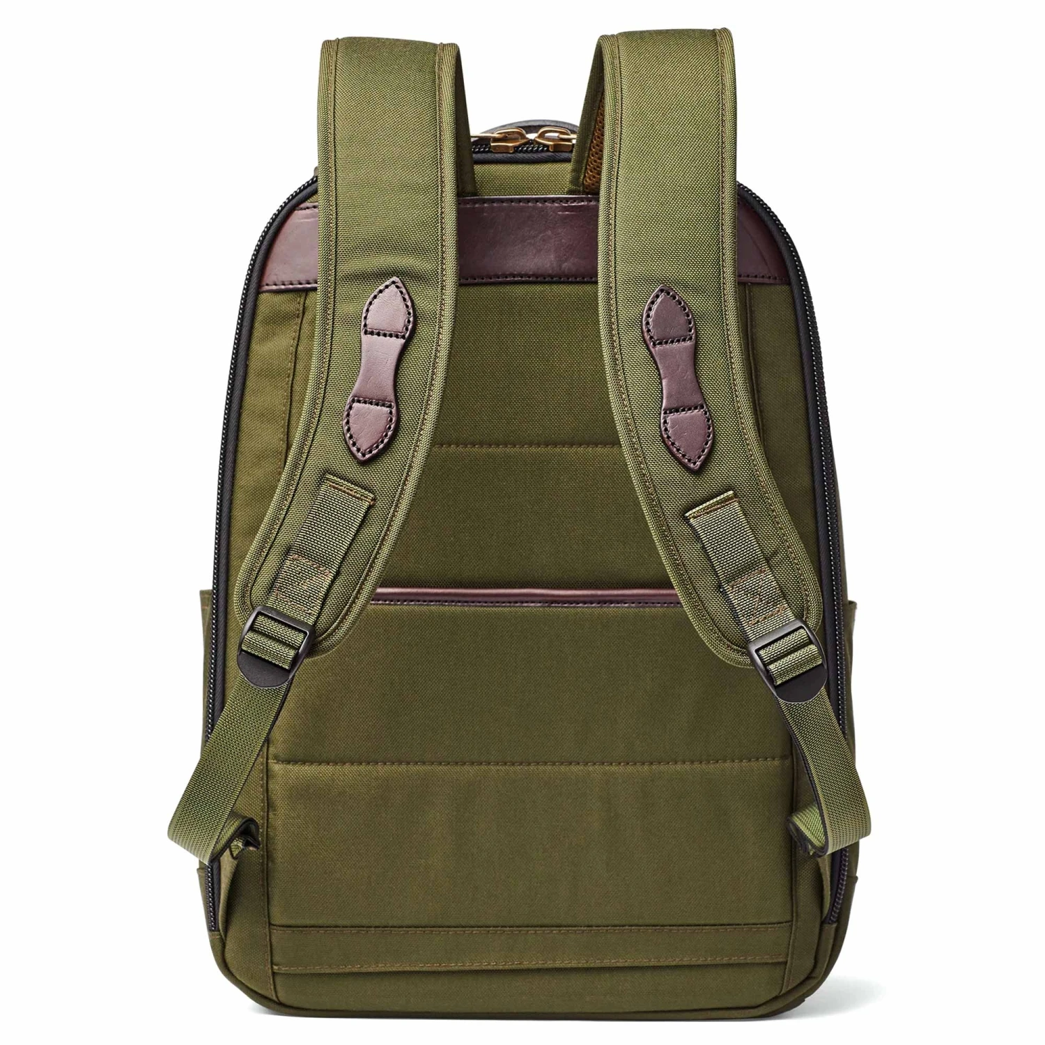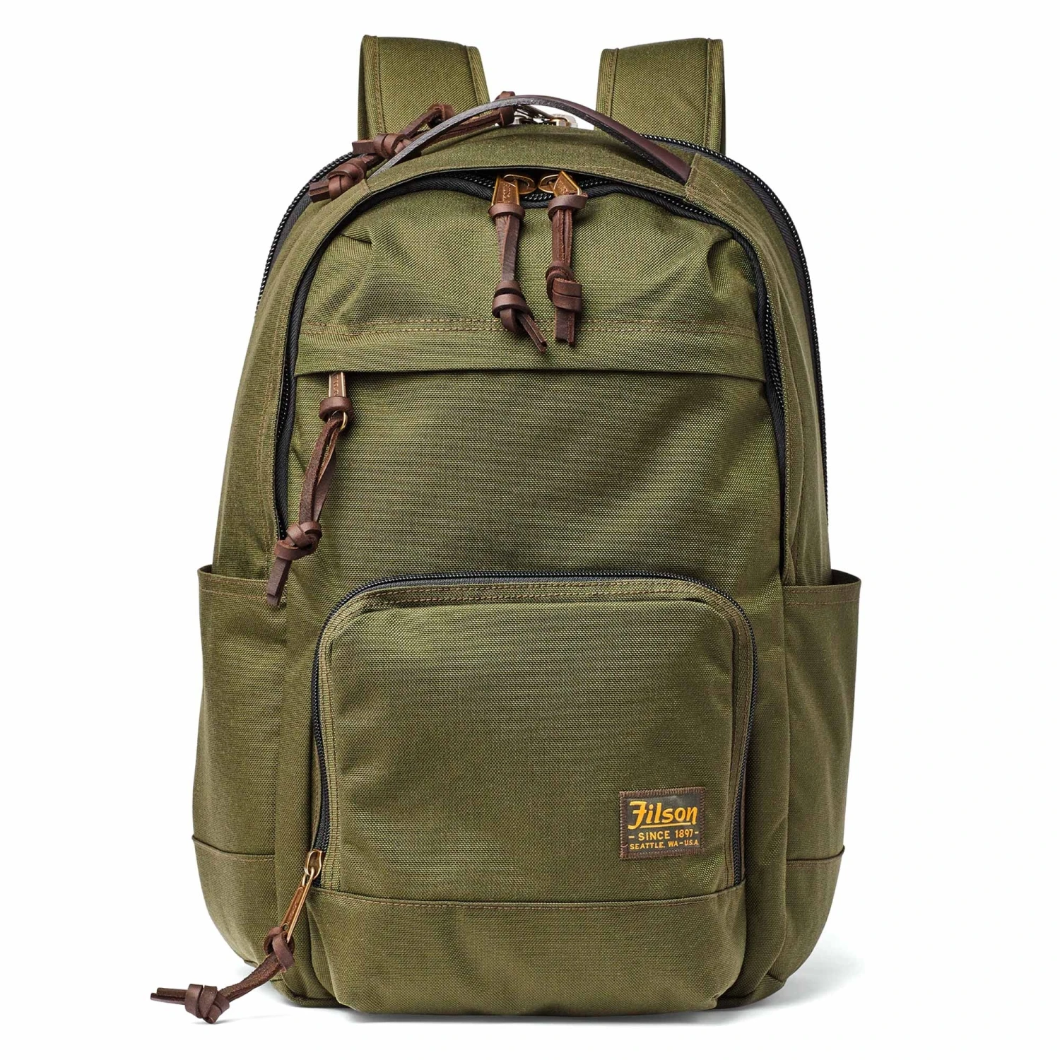 Made to withstand the bumps and scrapes of travel and everyday use, the versatile Filson Dryden Backpack is constructed from 1000-denier Cordura® nylon to be durable and weather-resistant. Features a double-layer reinforced bottom for added durability and a zippered rear panel hiding a padded laptop pocket. Heavy-duty coil zippers help prevent snagging. Finished with Bridle Leather and nylon webbing for multiple convenient carrying options.