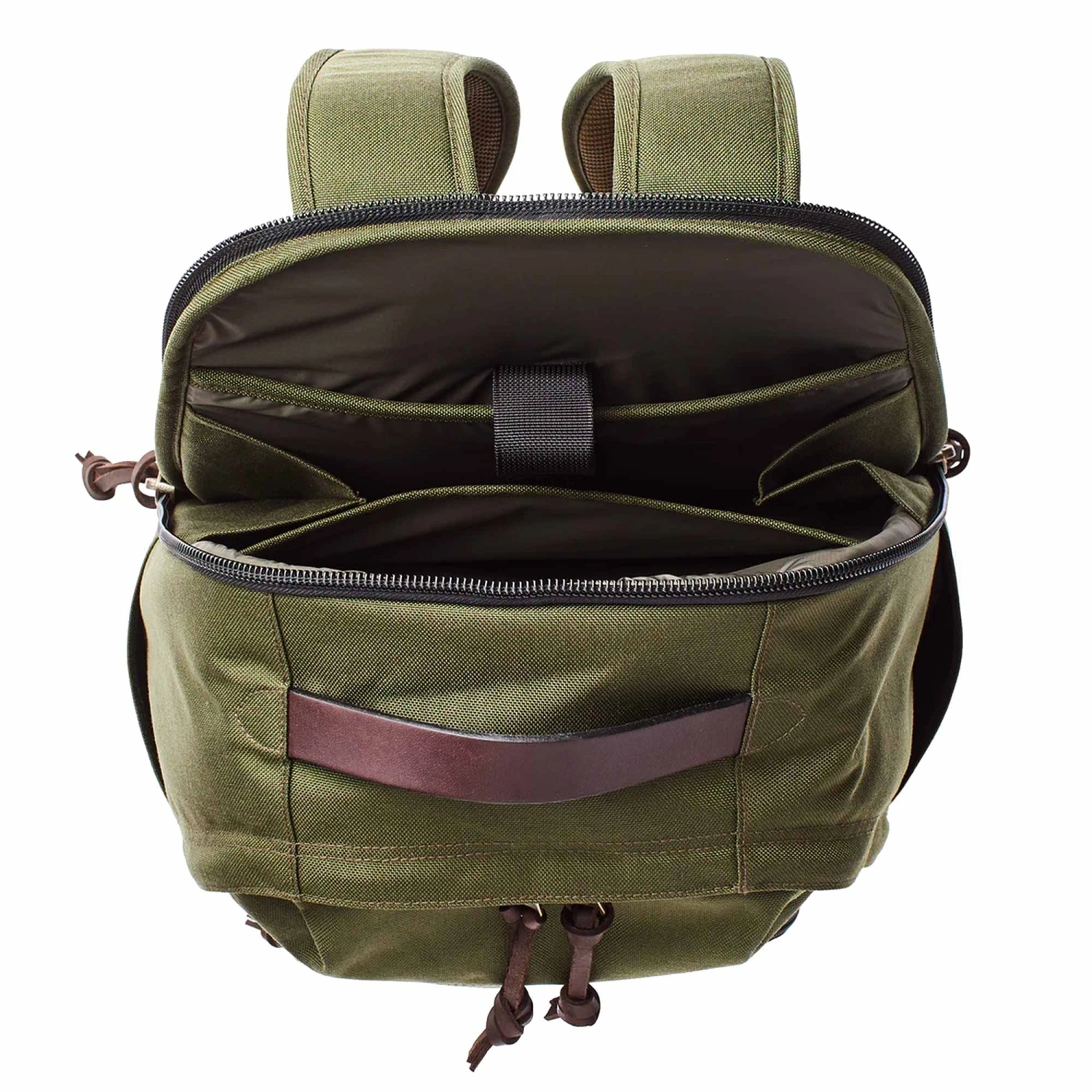 - Bridle Leather tabs on shoulder straps for gear attachment; Bridle Leather grab handle