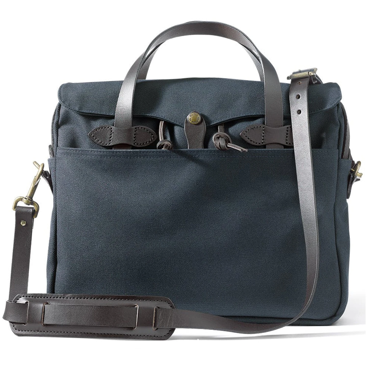 The classic Filson Original Briefcase is built with their signature Rugged Twill, an industrial-strength water-repellent fabric that resists wear and abrasion for years of dependable service. An adjustable Bridle Leather shoulder strap allows shoulder or cross-body messenger carry, and can be removed when you want to carry it by hand. The bag’s large interior compartment has dividers and slotted pockets for organisation.