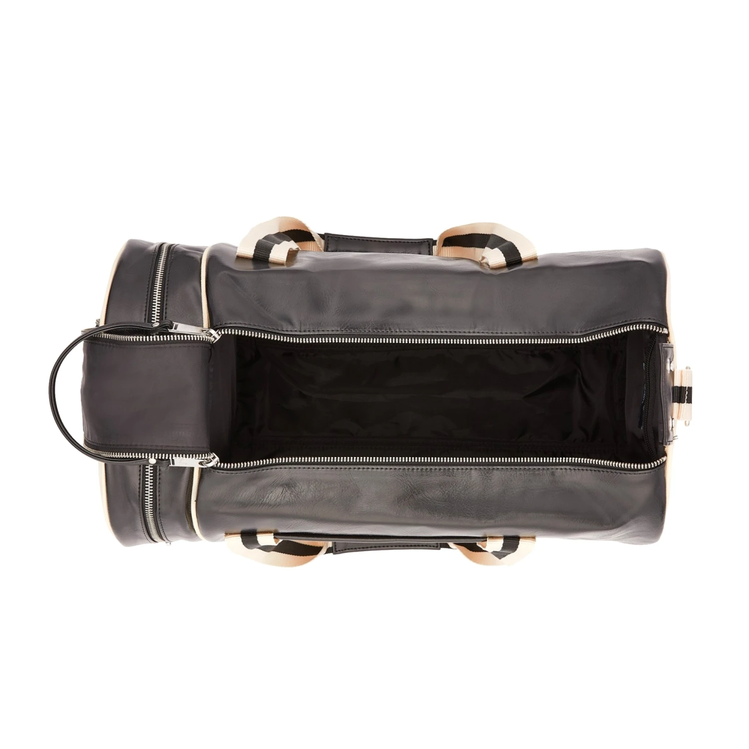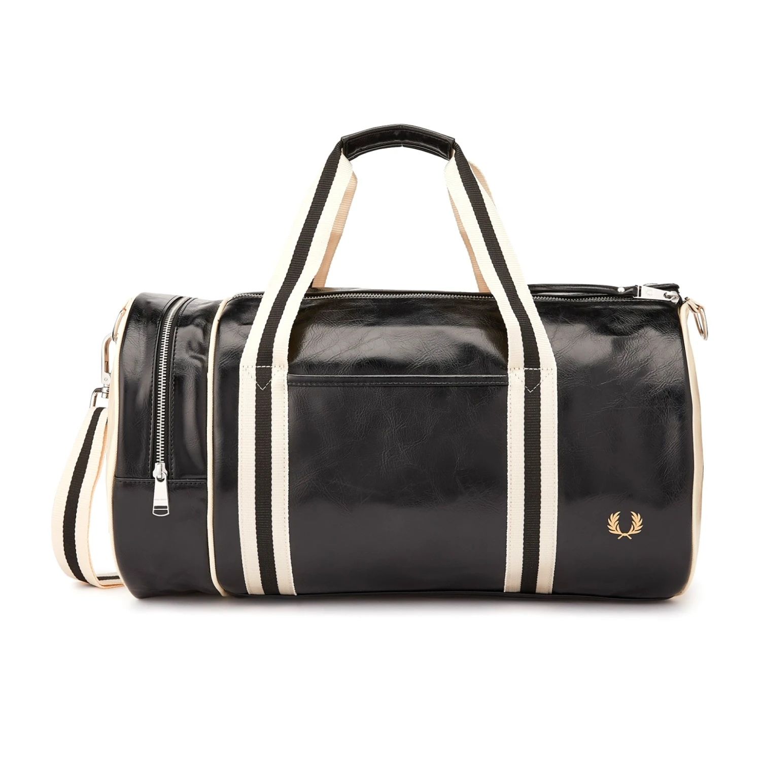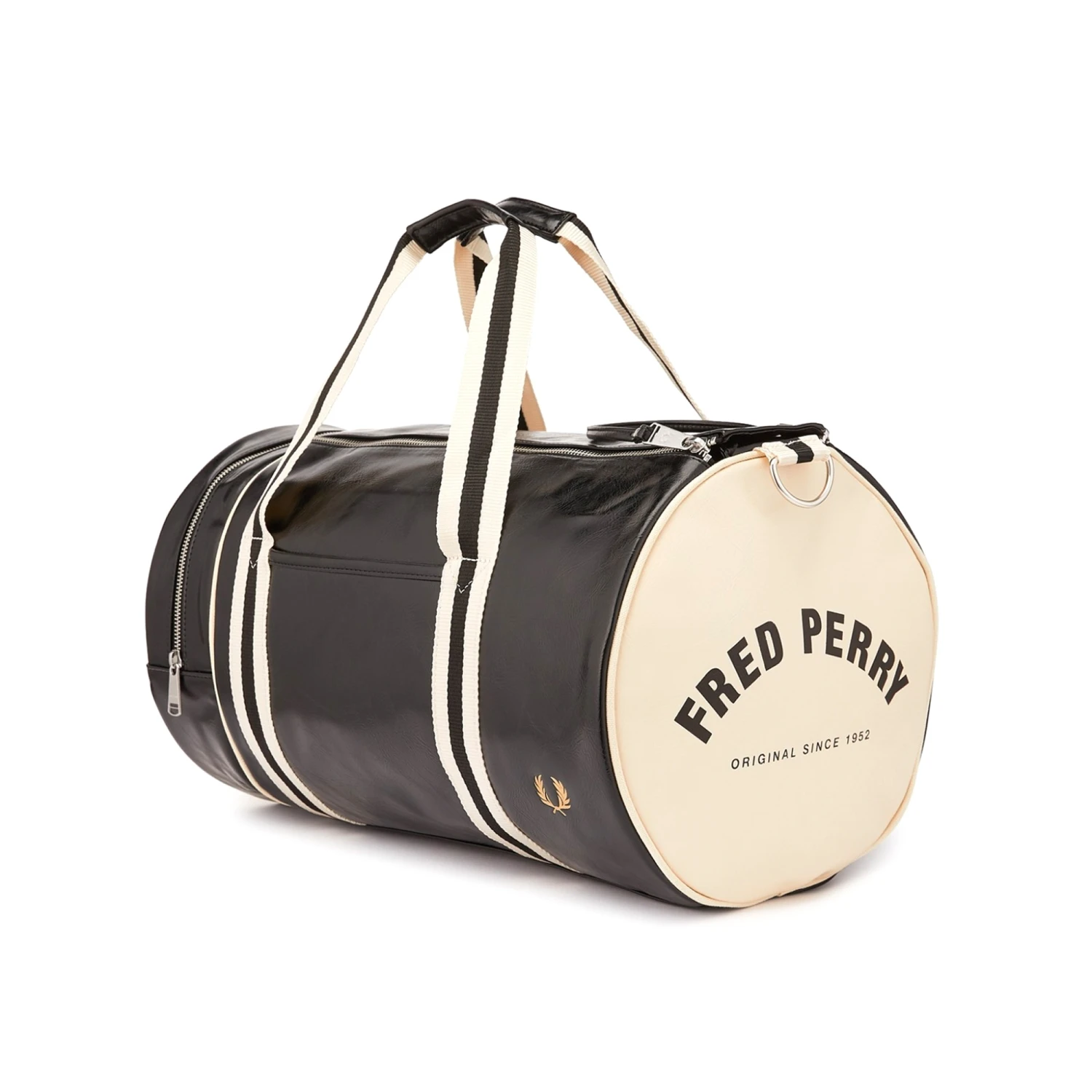 Fred Perry’s classic barrel bag crafted from a durable PU. With all the original details, such as strong webbing handles and a zip compartment at one end. This bag is perfect for weekends away with its large compartment and full zip, and is complete with a gold Fred Perry logo.
