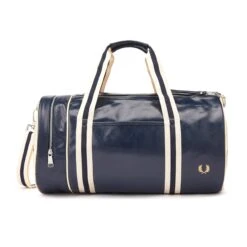 Fred Perry’s classic barrel bag crafted from a durable PU. With all the original details, such as strong webbing handles and a zip compartment at one end. This bag is perfect for weekends away with its large compartment and full zip, and is complete with a gold Fred Perry logo.
