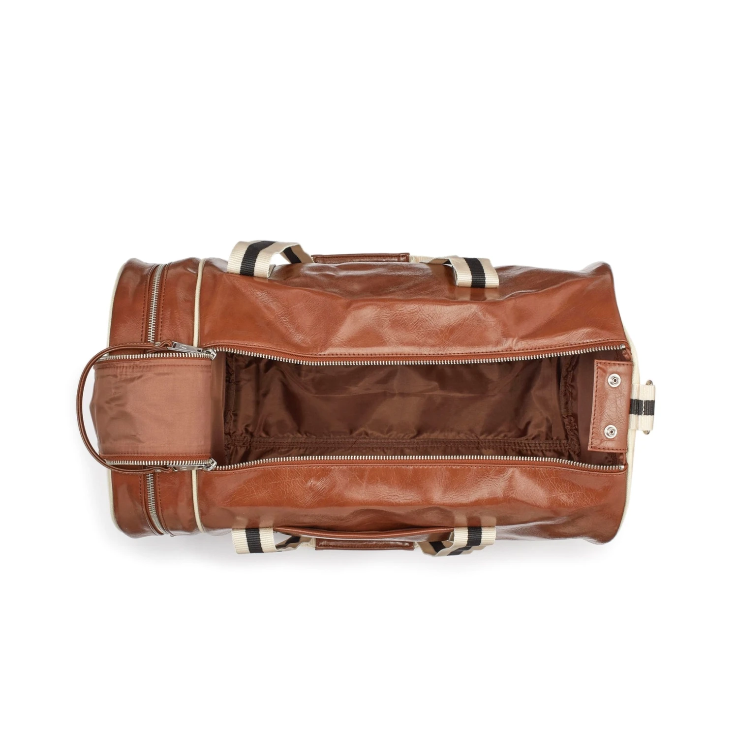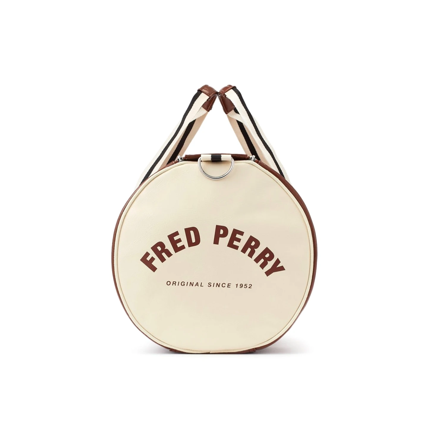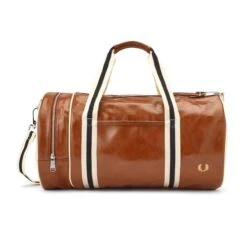 Fred Perry’s classic barrel bag crafted from a durable PU. With all the original details, such as strong webbing handles and a zip compartment at one end. This bag is perfect for weekends away with its large compartment and full zip, and is complete with a gold Fred Perry logo.