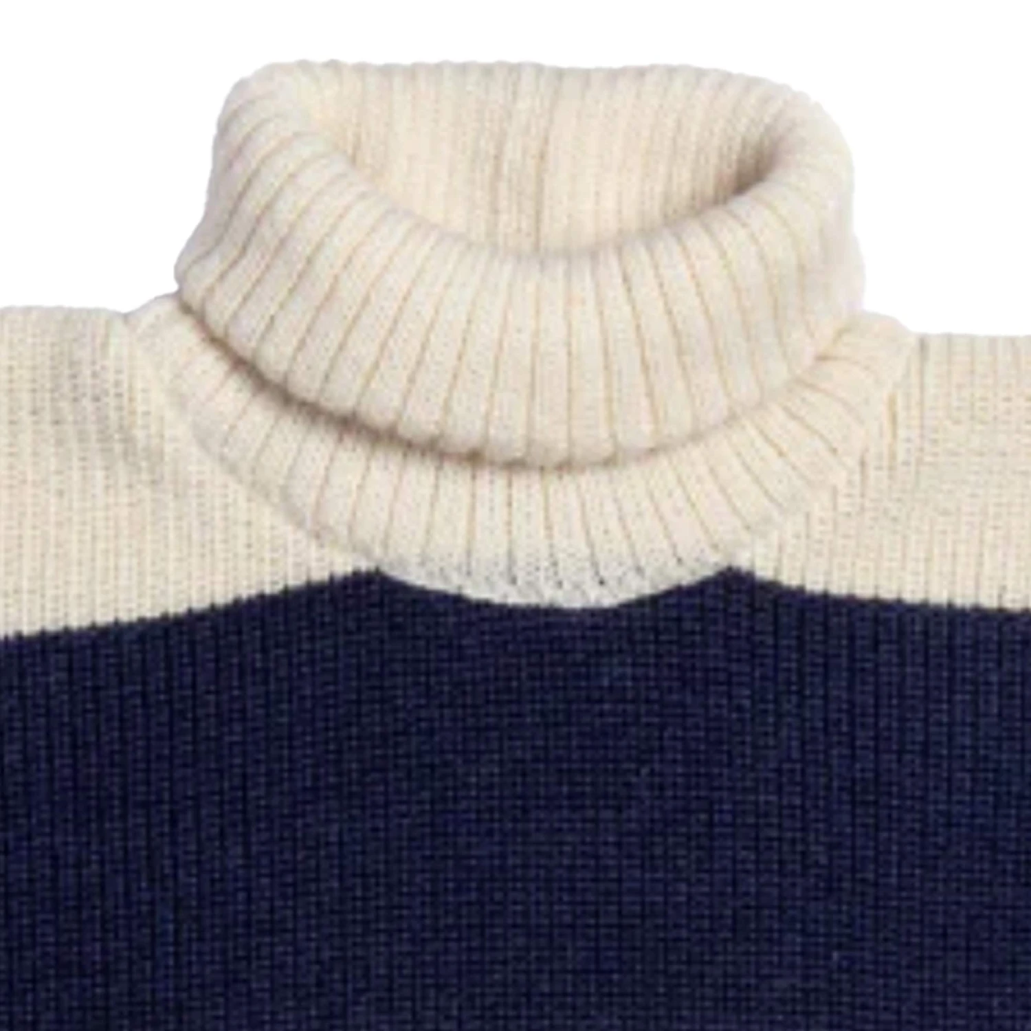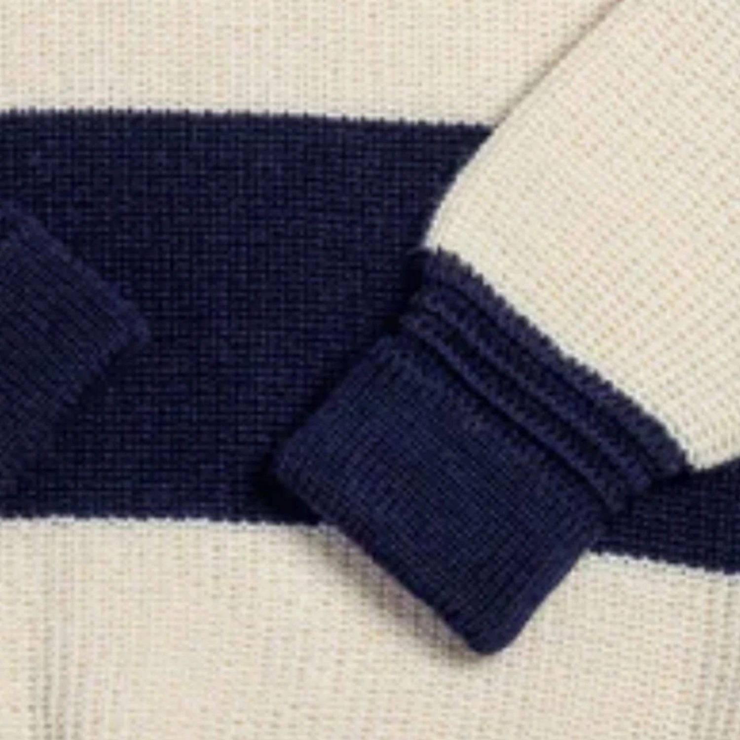 Using the same block as the core heavy knit jumpers, the bold knitted stripes take their inspiration from uniforms worn by sailing teams, and pitstop crews in motor racing. It’s comprised of a full kilogram of wool with the signature heavy 5-gauge knit, that’s designed to keep you warm on even the coldest of days. Made from extra-long fibres, its highly resistant to pilling and will look continue to look fantastic even after years of regular wear, and unlike most knitwear producers we leave the natural oils in our wool yarn, meaning their jumpers have self-cleaning and water-resistant properties. The sleeves and collar are attached by hand, which is more time consuming and labour intensive than using a standard machine stitch but results in a superior finish.
