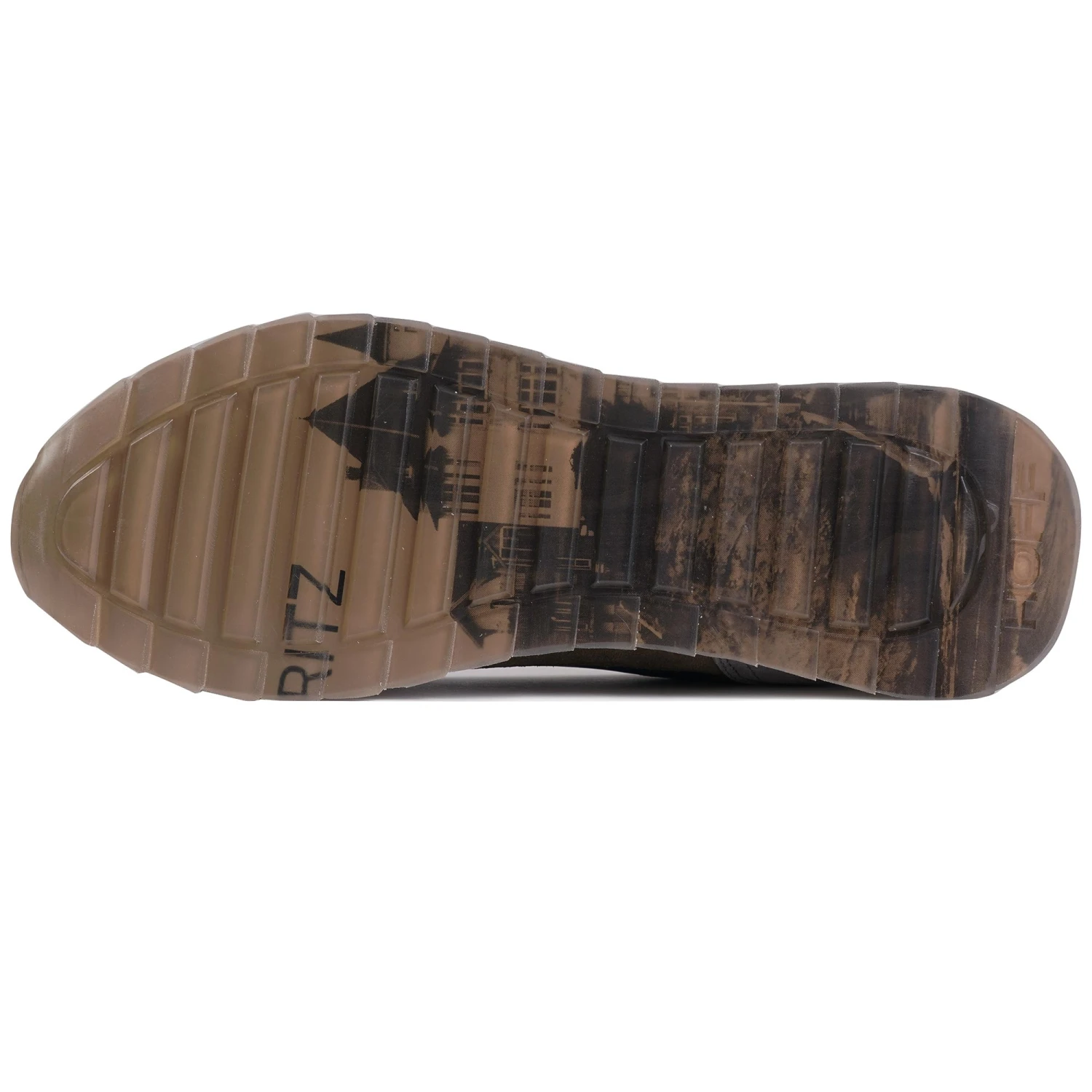 - Serrated sole and printed image inside transparent rubber