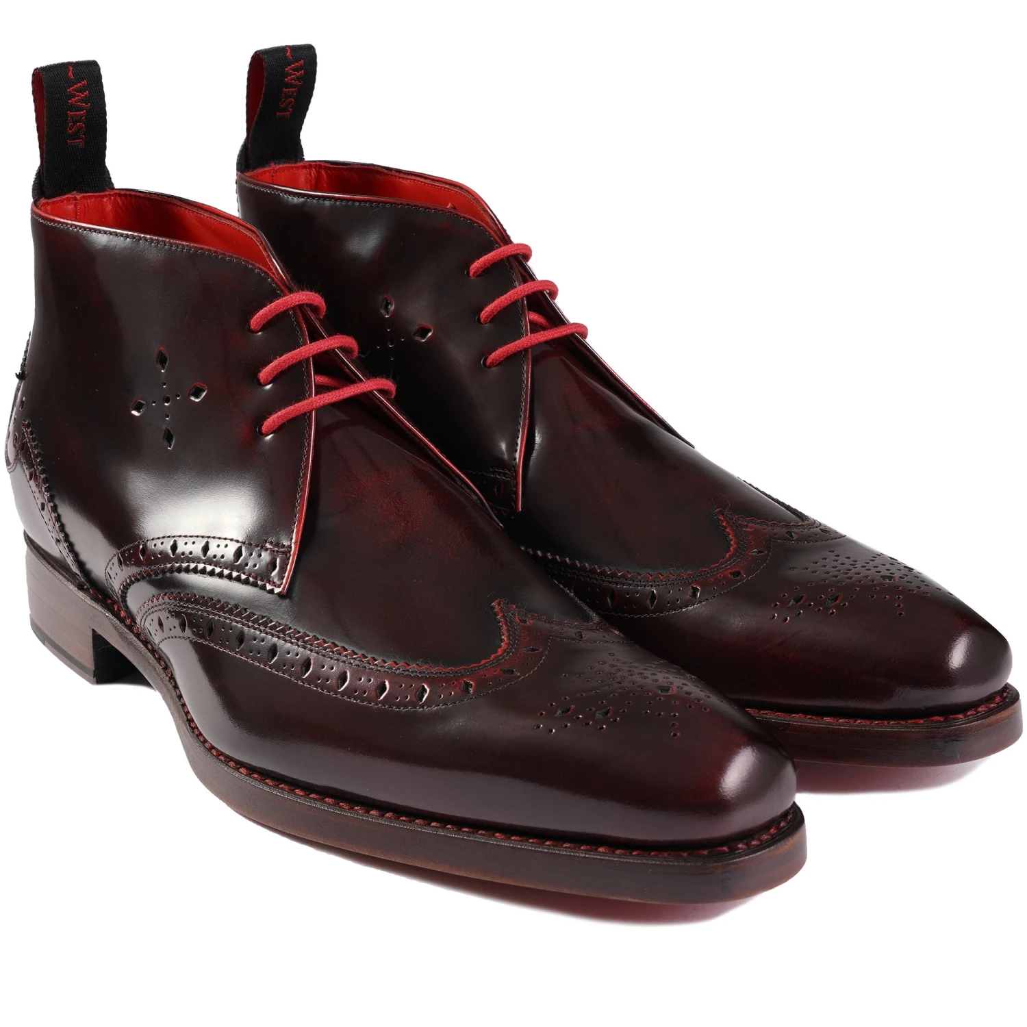 The ‘Falcata’ Wing tip Chukka boot on the Dexter last shape – in Vintage Red polish leather. Features a deathmoth toe punch, 5 and diamond brogue punching and ‘is Love the Drug’ sole design.