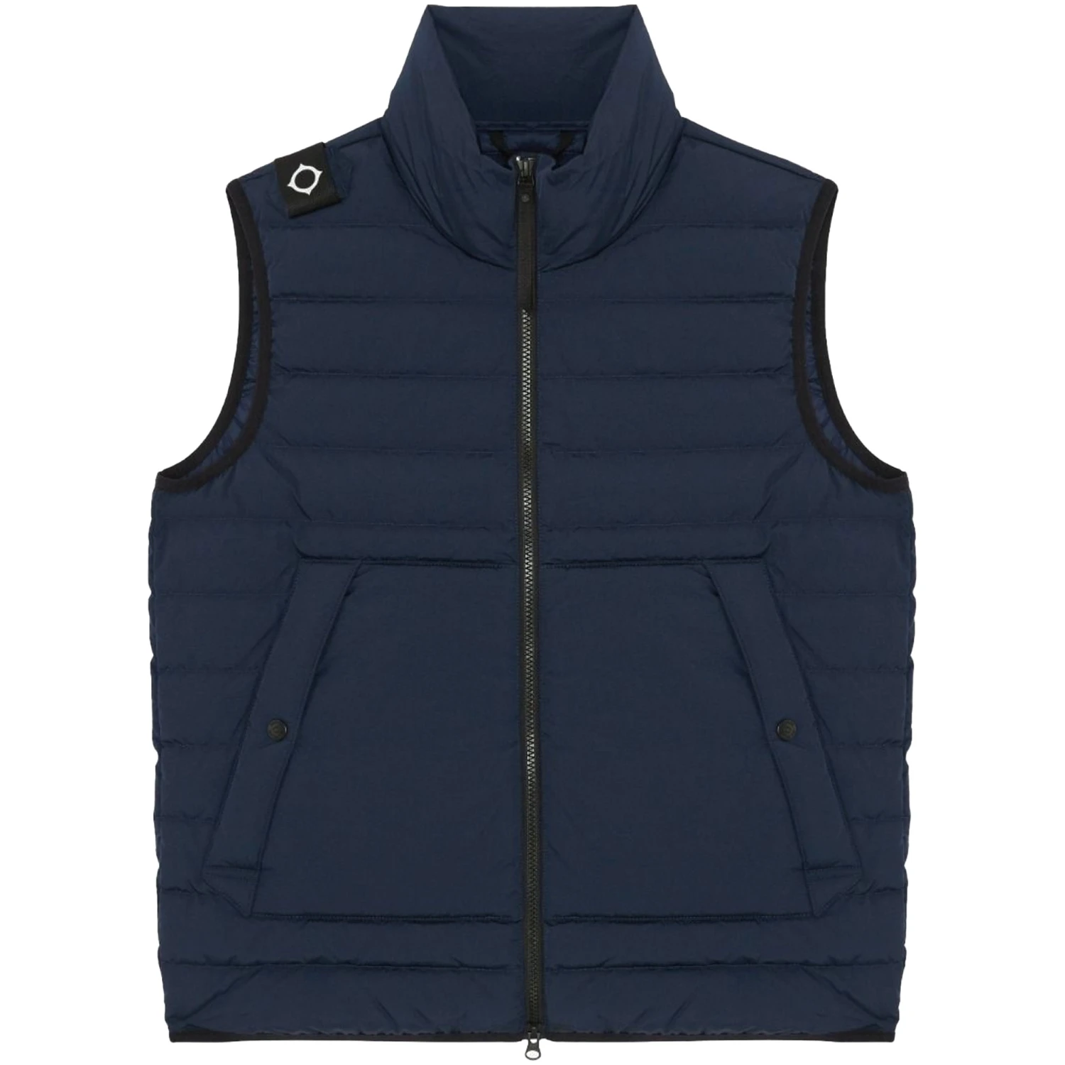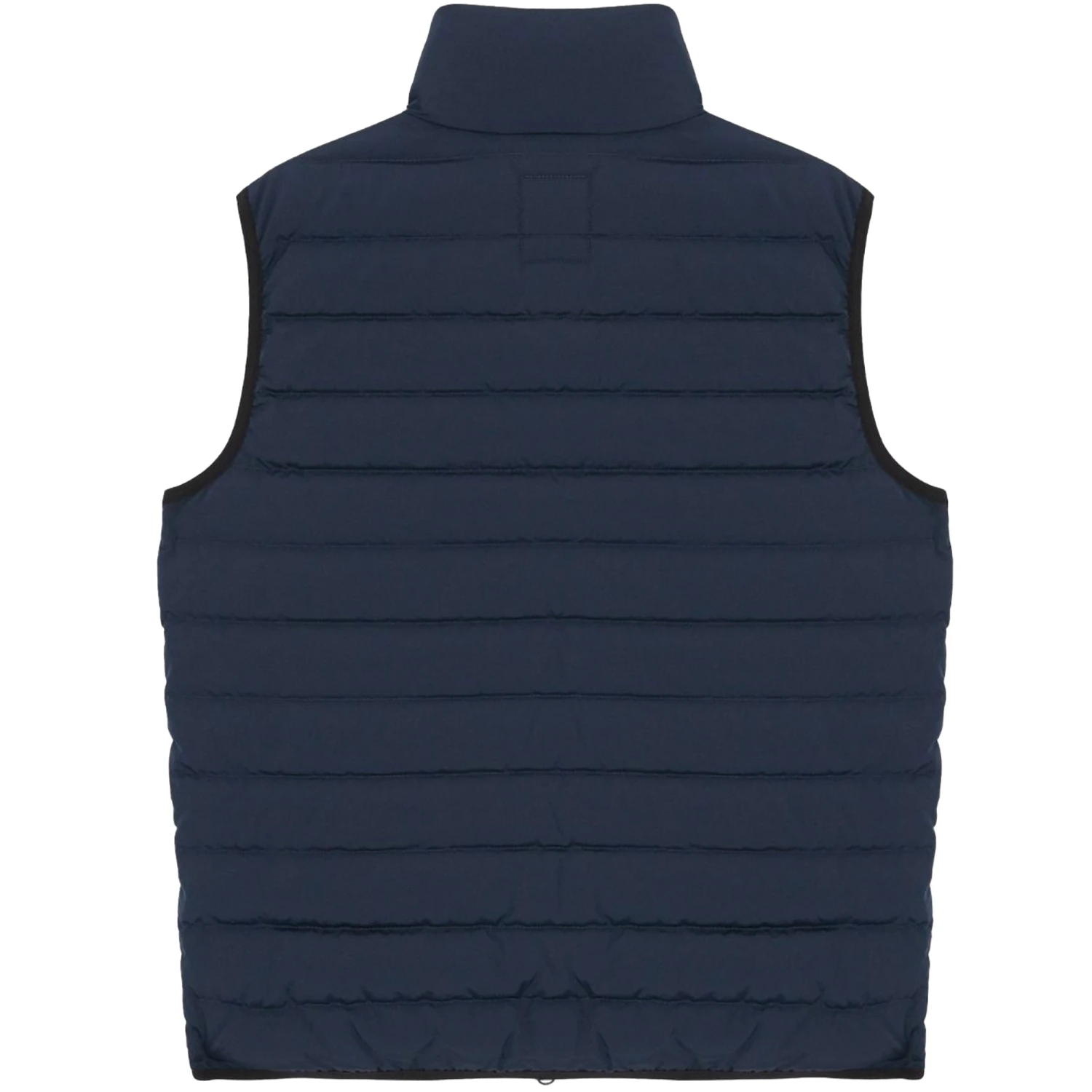 The gilet down jacket is Constructed from an ultra fine denier nylon and then pre-washed to achieve an iridescent look. This cloth has a water resistant coating, is breather and quick drying. The garment is padded through direct injection with a high quality feathers.