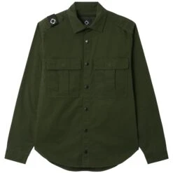 Patch Pocket Parade Overshirt made from cotton Gaberdine garment washed to achieve a laundered finish with a soft handle. Features a snap fasten front, stand-up collar, two military inspired front chest pockets and shaped hem.