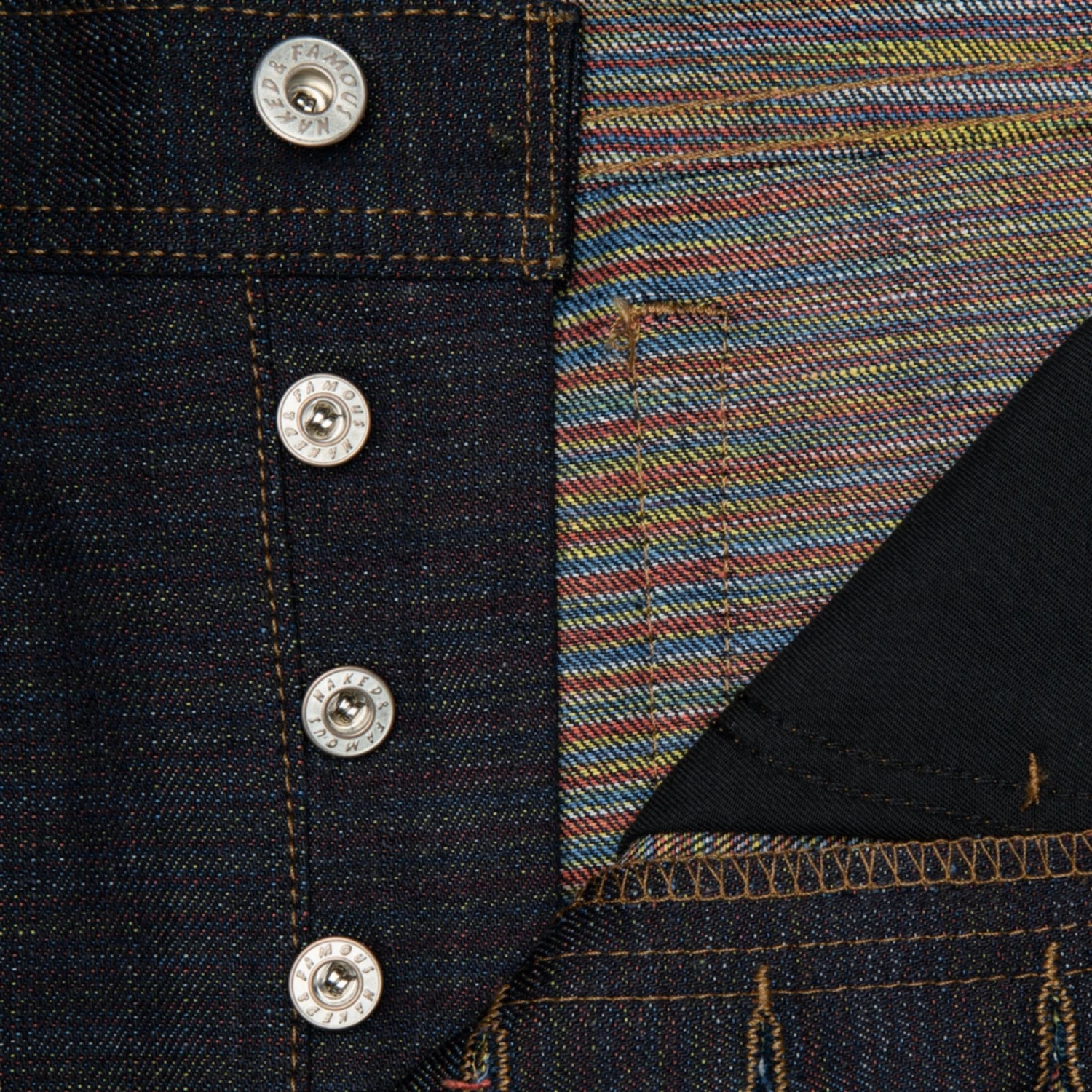 The Japan Heritage Kasuri is a 14.5oz Japanese selvedge denim with a colourful Kasuri dyed weft interior. The cotton weft yarns are laid out lengthwise and dye is applied in sections perpendicular to the length of the yarn. The result is a single strand of yarn with a gradient of colourful tones throughout. This is then combined with a slubby rope-dyed indigo warp and slowly woven on vintage shuttle looms at a low tension in such a way as to create an uneven organic texture, reminiscent of hand-woven fabrics. Cut, sewn, and built in Canada with contrast stitching, vintage pink line selvedge ID, vegetable-tanned leather patch, and silver metallic buttons and rivets.