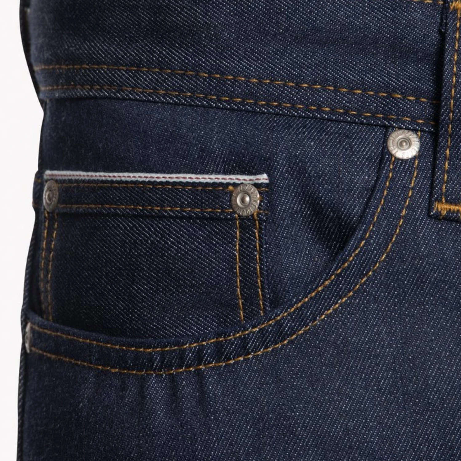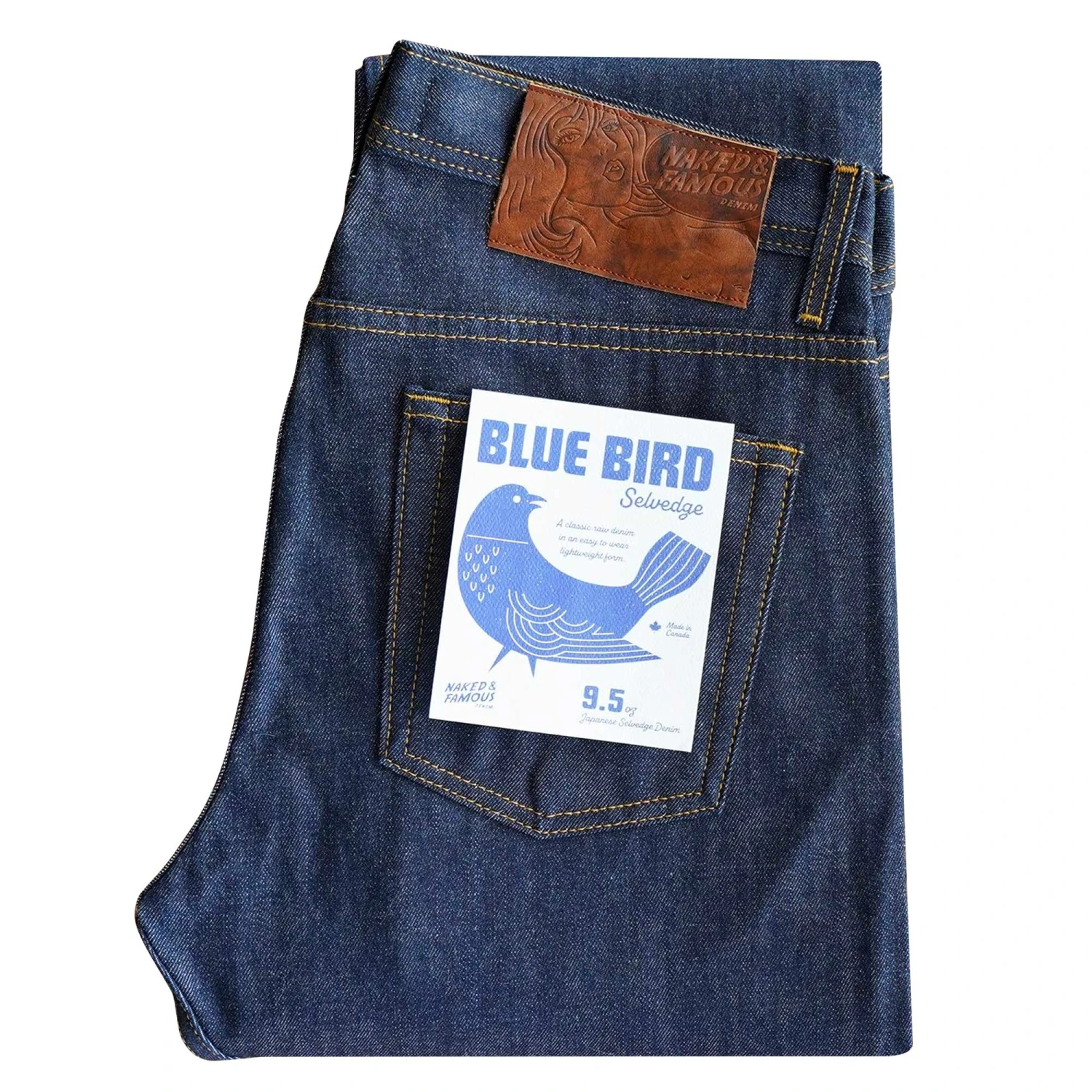 The Blue Bird Selvedge is a lightweight 9.5oz Japanese Selvedge denim. Designed for those who want to enjoy a classic raw denim look in a lightweight form. Despite being lightweight the denim maintains a level of rigidness, so some break in time is necessary and the deep shade of indigo ensures maximum fading potential. Cut, sewn, built in Canada with contrast stitching, classic redline selvedge ID, a brown tanned leather patch, and silver metallic buttons and rivets.