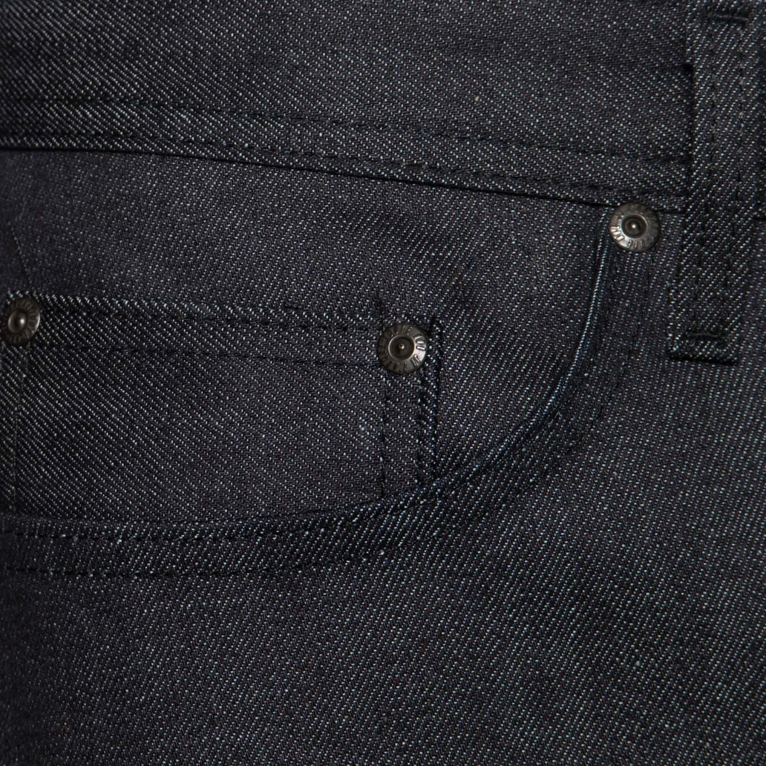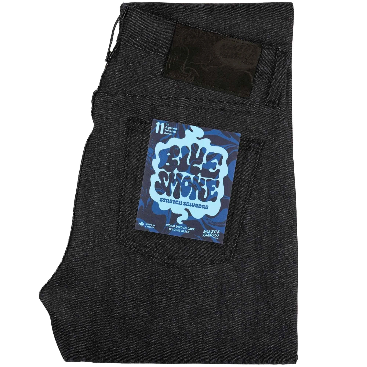 The Blue Smoke Stretch Selvedge is an 11 oz Japanese Selvedge denim that is so dark it appears black, but it is actually indigo dyed. The secret is a little black tint is added to the dye to give this fabric its distinctive smokey colour. This is added by the white weft peeking through the twill lines. This denim is made with 2% stretch for added comfort, without compromising durability. This fabric is crisp and rigid with that classic raw denim feel. Cut, sewn, and built in Canada with black stitching, black suede patch, and mil-spec non-reflective black metal buttons and rivets.