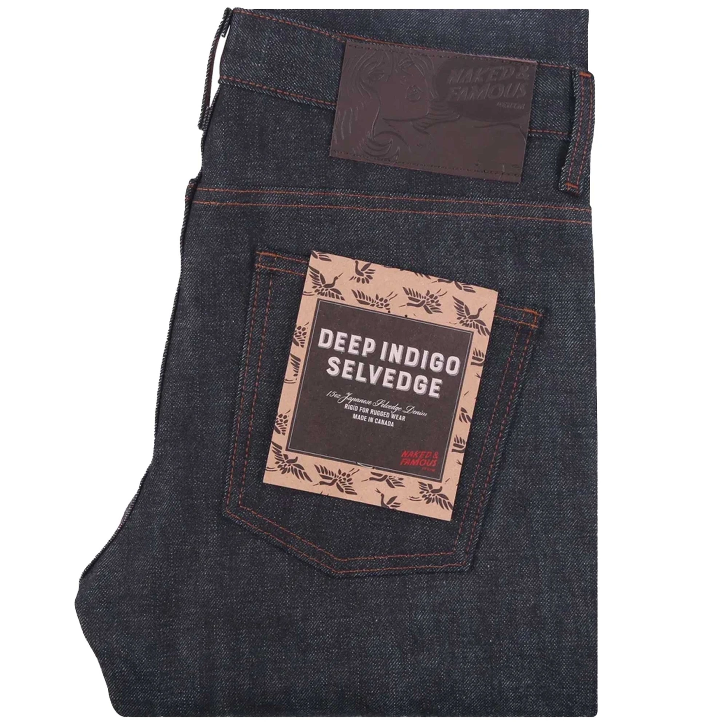 15oz indigo rope dyed Japanese selvedge denim, woven on vintage shuttle looms in a right hand twill construction. The Indigo dyed warp and white weft combined with a red line selvedge ID give these jeans a classic look. The fabric is incredibly rigid which produces distinct wear patterns. Over time with wear, the deep indigo colour fades to electric blue hues, resulting in high contrast fades.