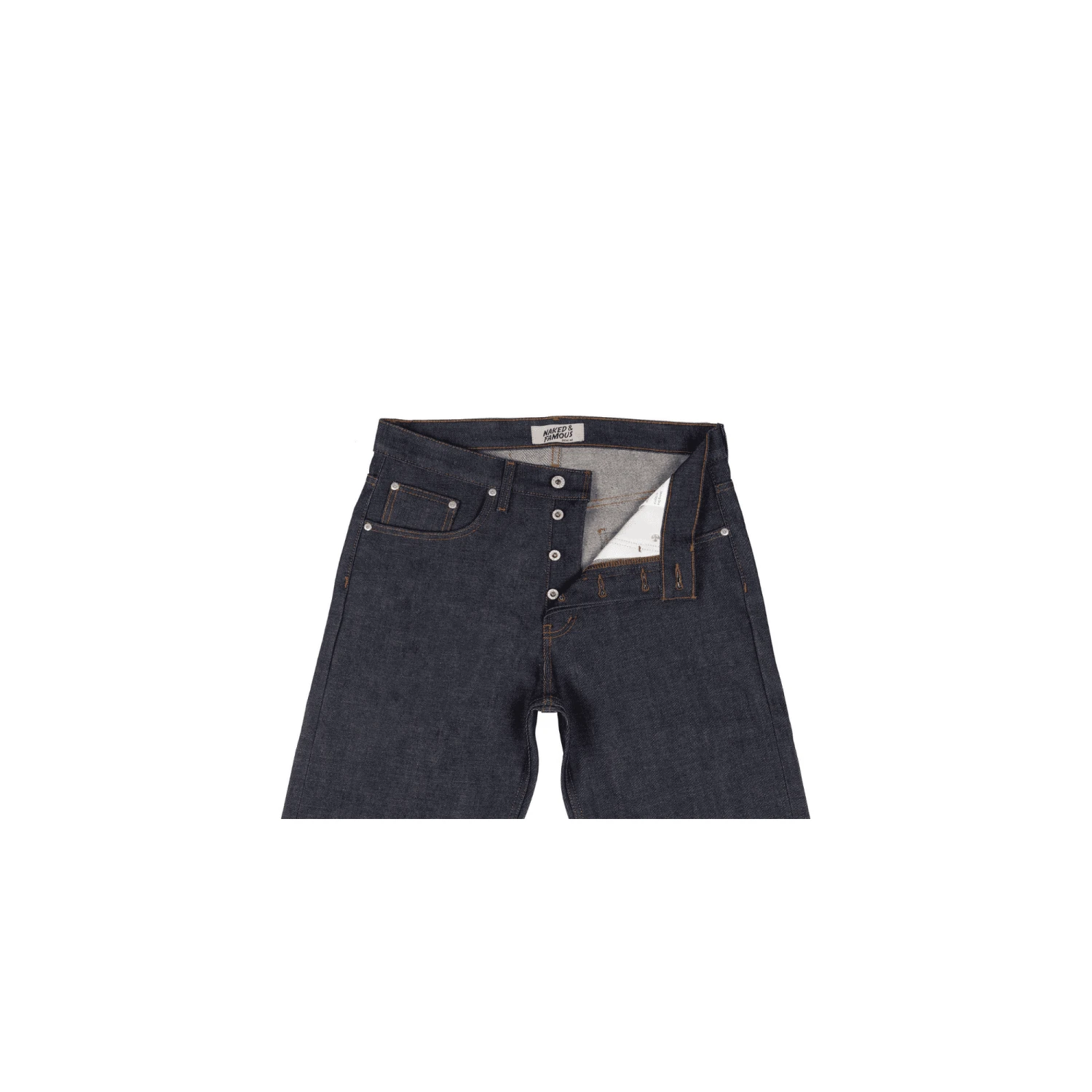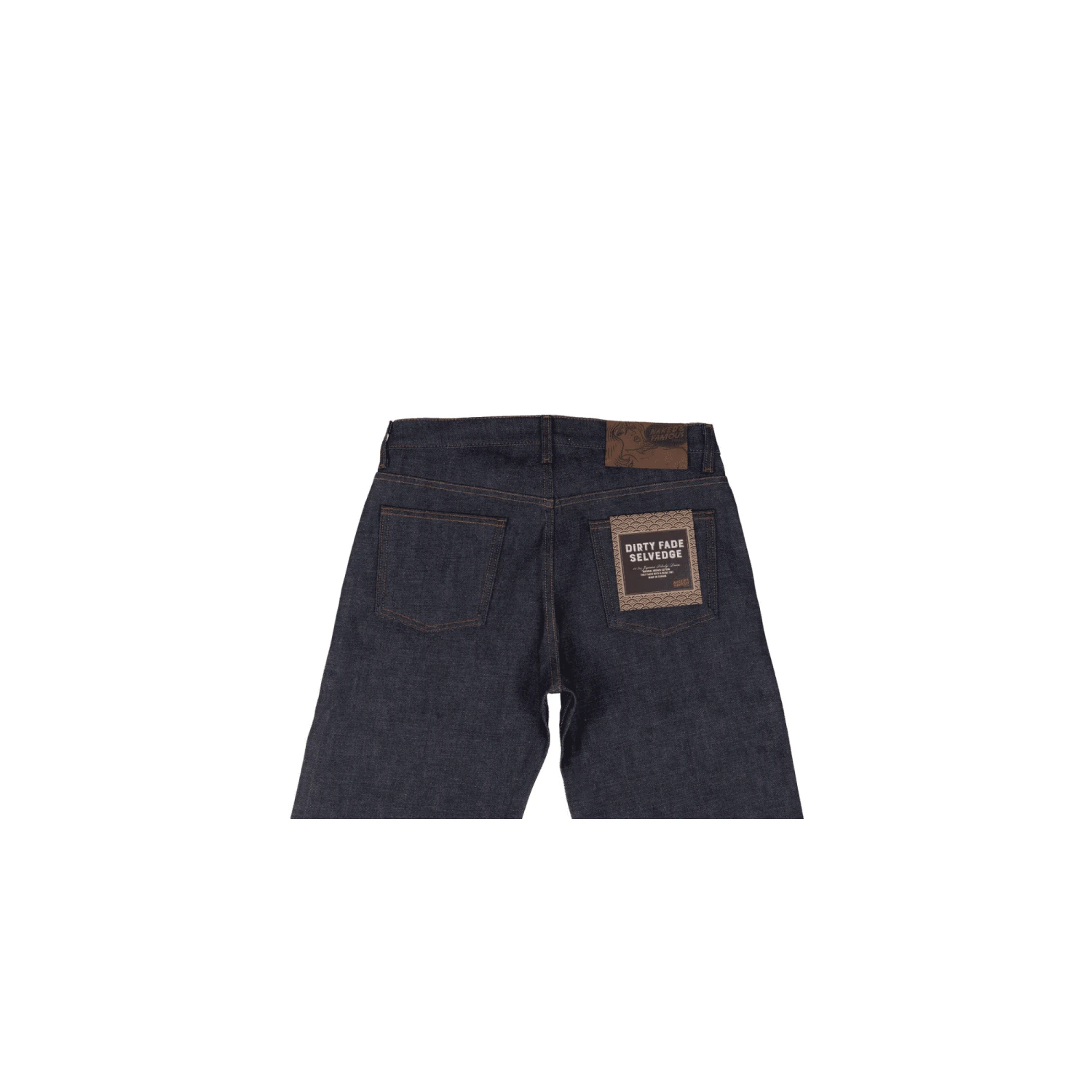 The Dirty Fade Selvedge is a 14.5oz indigo rope dyed Japanese selvedge denim, woven on vintage shuttle looms in a right hand twill construction. The indigo dyed warp yarns start off as a dusty brown shade of cotton. Over time with wear, layers of indigo will begin fade away revealing a brown undertone, hence the name Dirty Fade. Other details include contrast stitching, roughout tan leather patch, red selvedge ID, silver metallic buttons and rivets. The Weird Guy is a relaxed straight fit; high rise, fuller in the seat and thigh that falls to a wide leg opening.