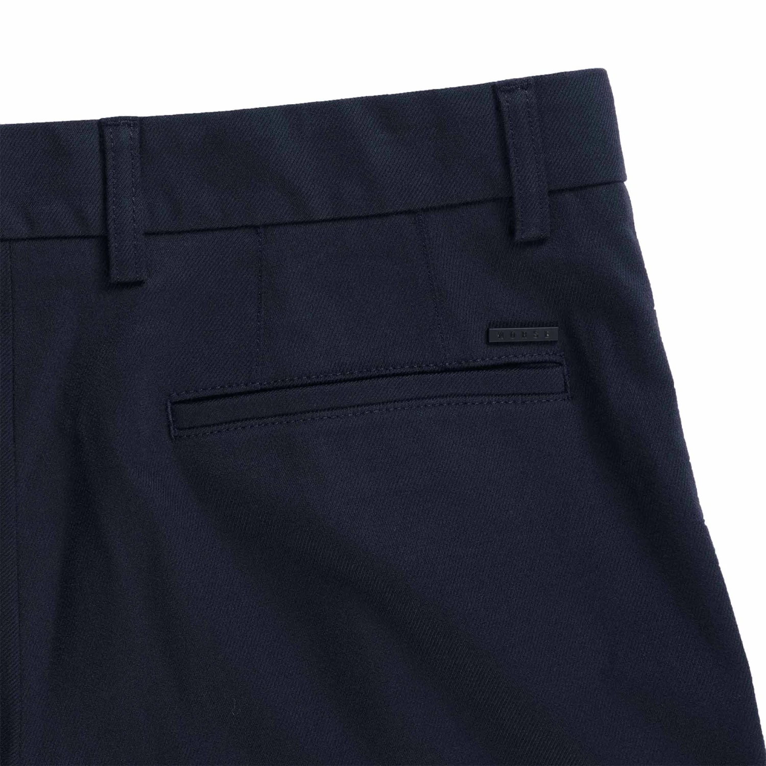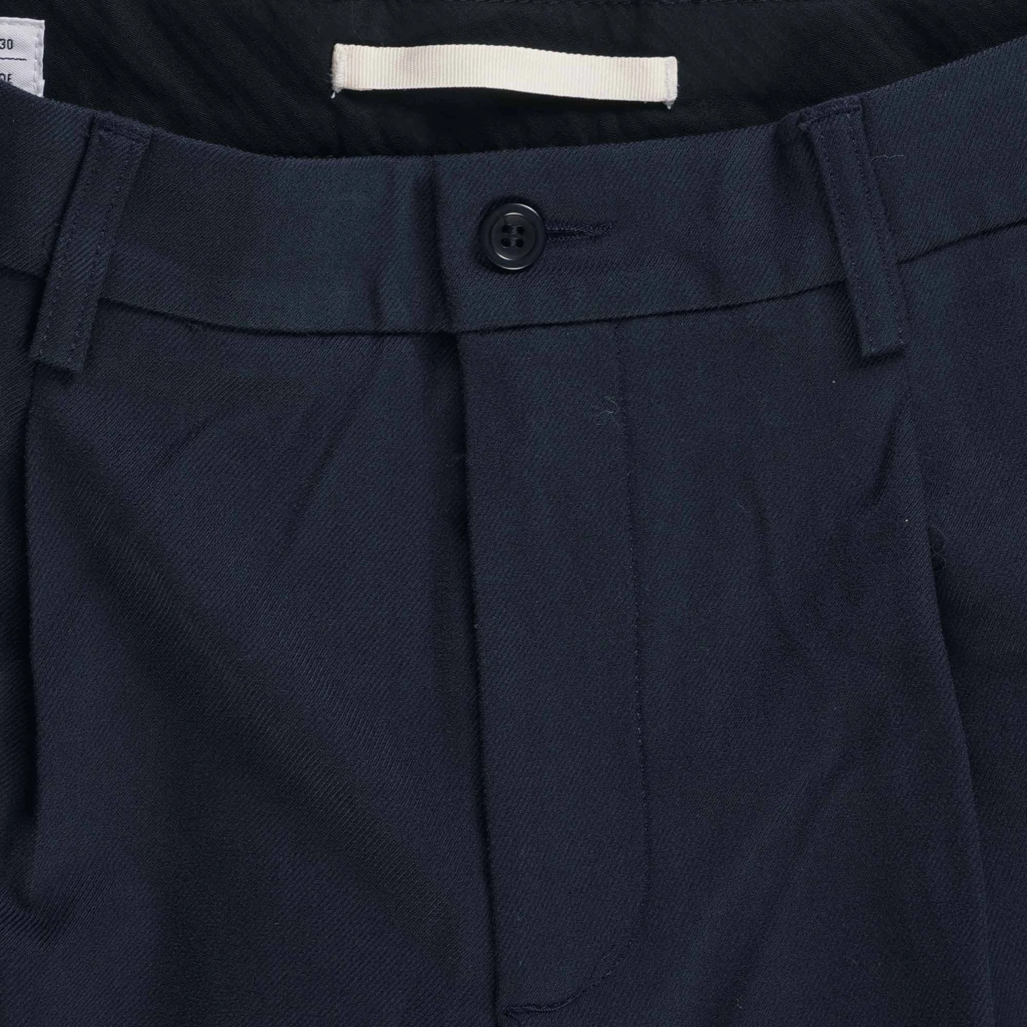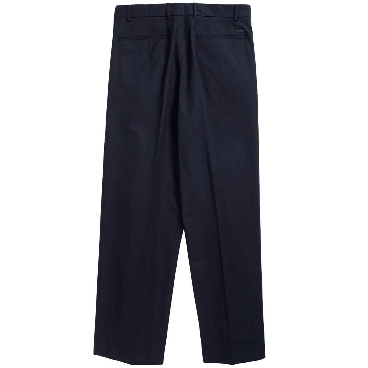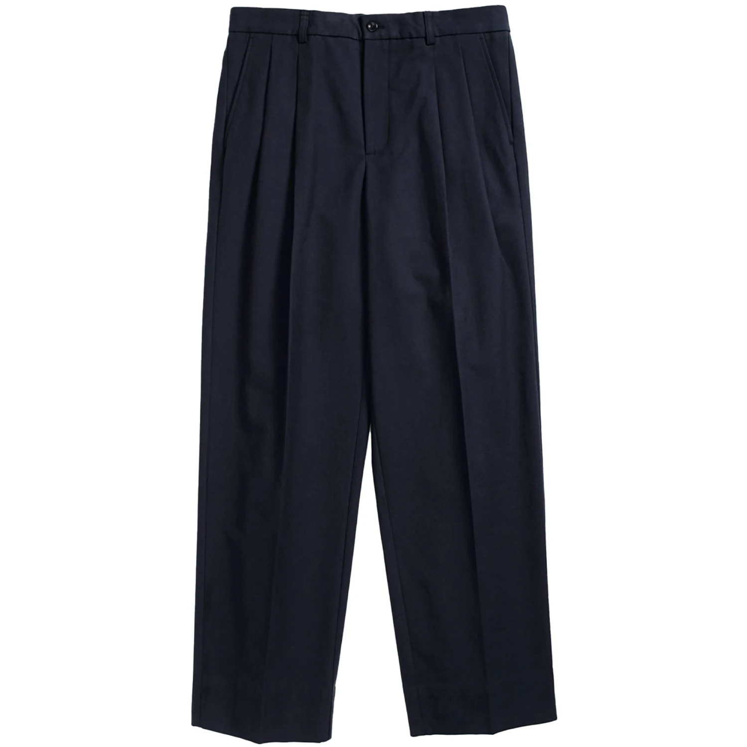 A relaxed fitting tailored pant, cut with a loose leg and double pleats at the front. Constructed in a cotton wool blend fabric with a twill structure, that has a mid-weight drape. Finished with an internal half lining, zip fly and flap pocket details at the back.