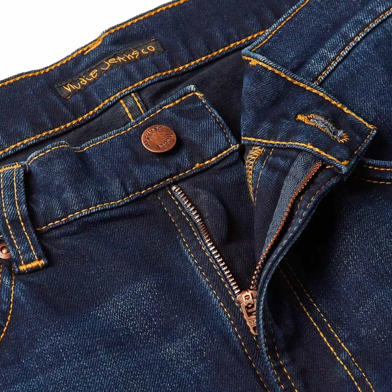 Slim fit jeans with a tapered leg made in organic comfort stretch denim. A lovely pair of deeply dark indigo jeans with subtle abrasions and slightly contrasting wear marks. The denim used for these jeans has a slightly special making; the warp yarns are dyed to an intense indigo tone, whereas the weft yarns, usually kept white, are dyed black. It is this somewhat unconventional making of the denim that gives these jeans their outstanding ink-like hue.