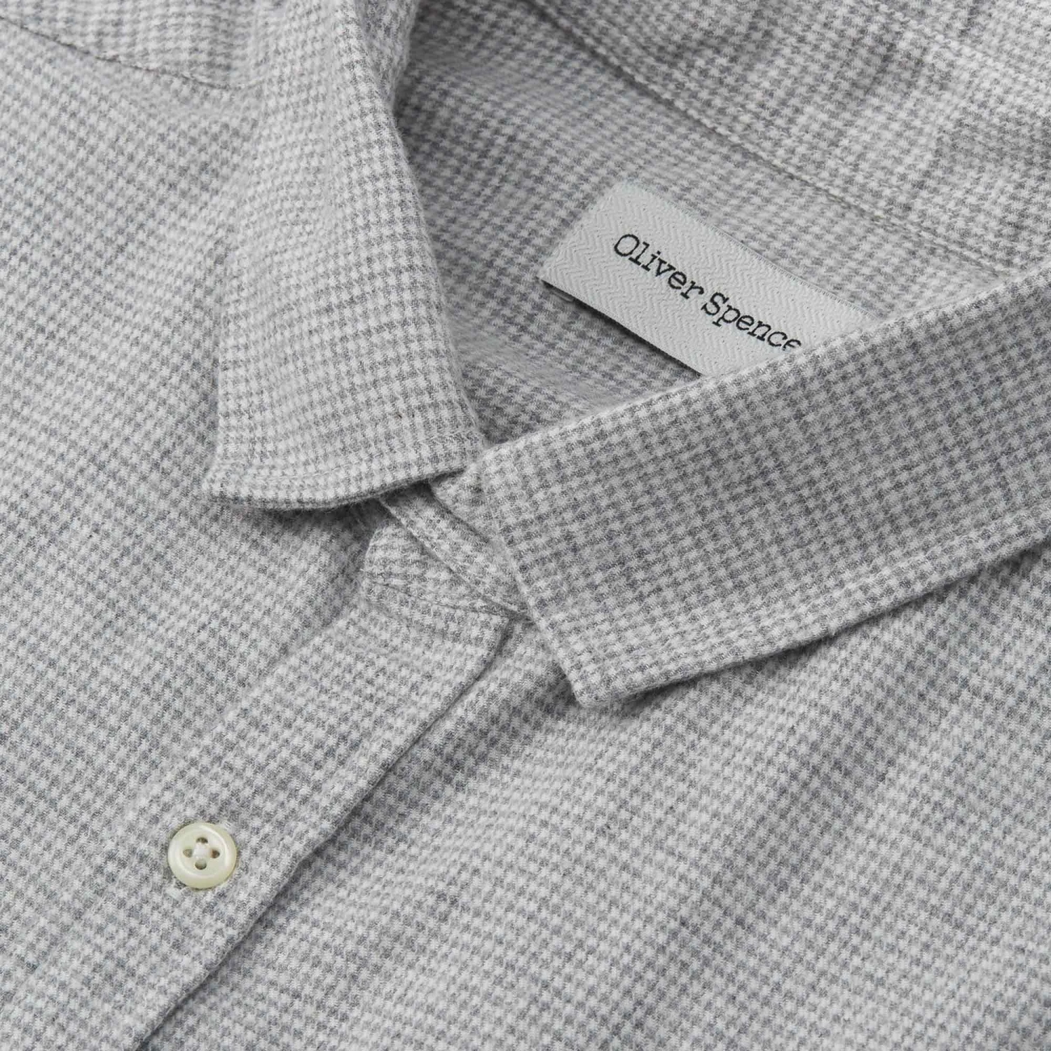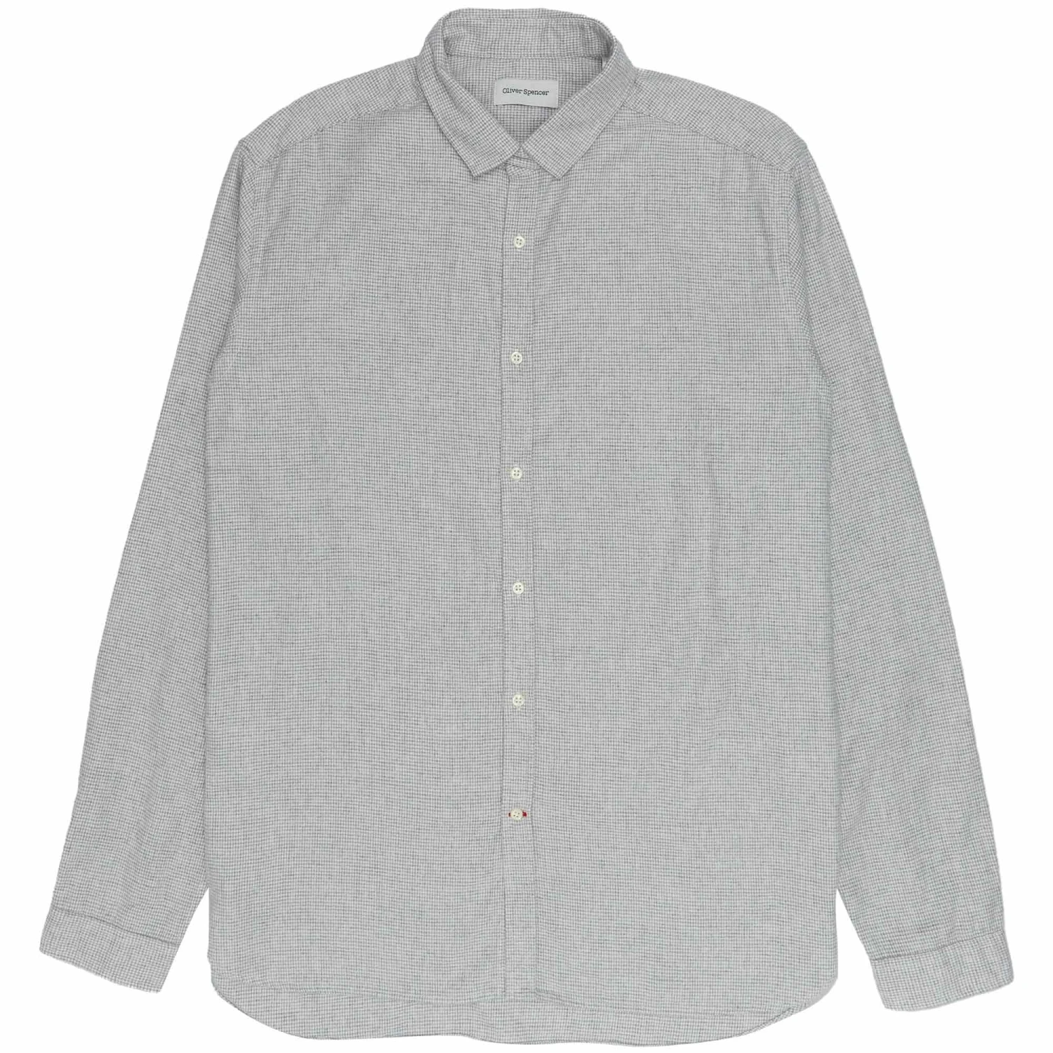 The Clerkenwell Tab Shirt is an Oliver Spencer favourite and a wardrobe staple. Featuring a slim, square collar that conceals an optional fastening tab, this version has been crafted in a beautifully soft brushed cotton fabric with a micro-dogtooth pattern.