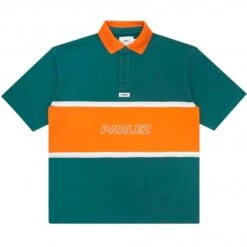 The Blake Short Sleeve Shirt in Dusty Teal. A short sleeve Rugby silhouette constructed from an organic and recycled loopback cotton blend. Featuring a button-down placket with a contrasting chest panel and collar. Detailed with a woven side seam label and embroidered branding.