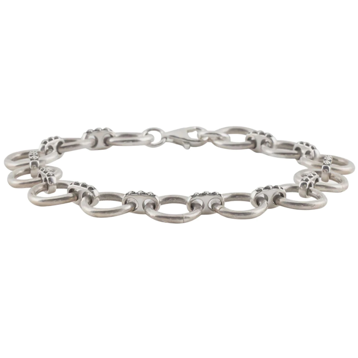 The silver wren link bracelet is built of a one-of-a-kind link structure with Tudor detailing between each link. The Goldsmiths Company Assay office certifies the quality of this piece, which is made of 925 Sterling Silver. This bracelet is made up of a series of strong silver rings, each connected to the next by a rectangle-shaped link.