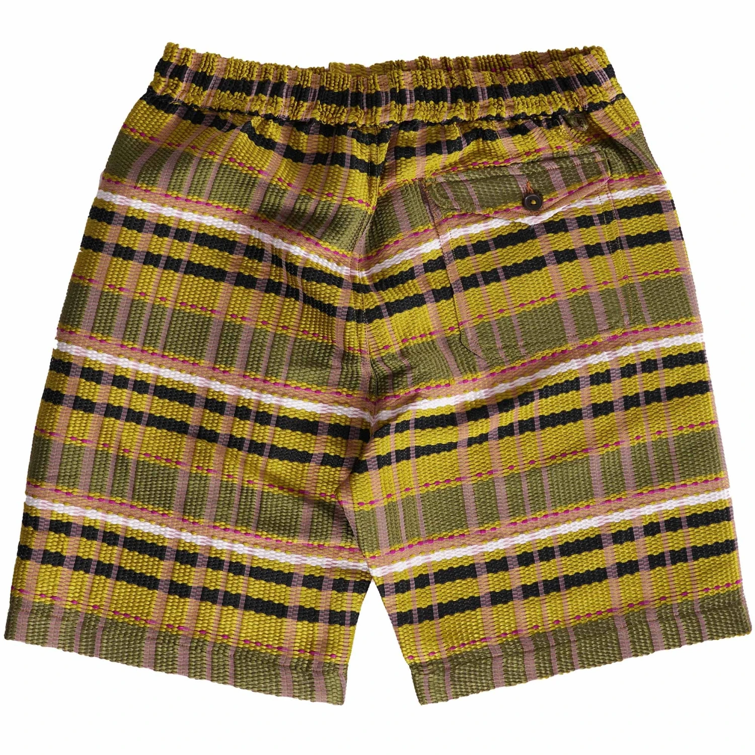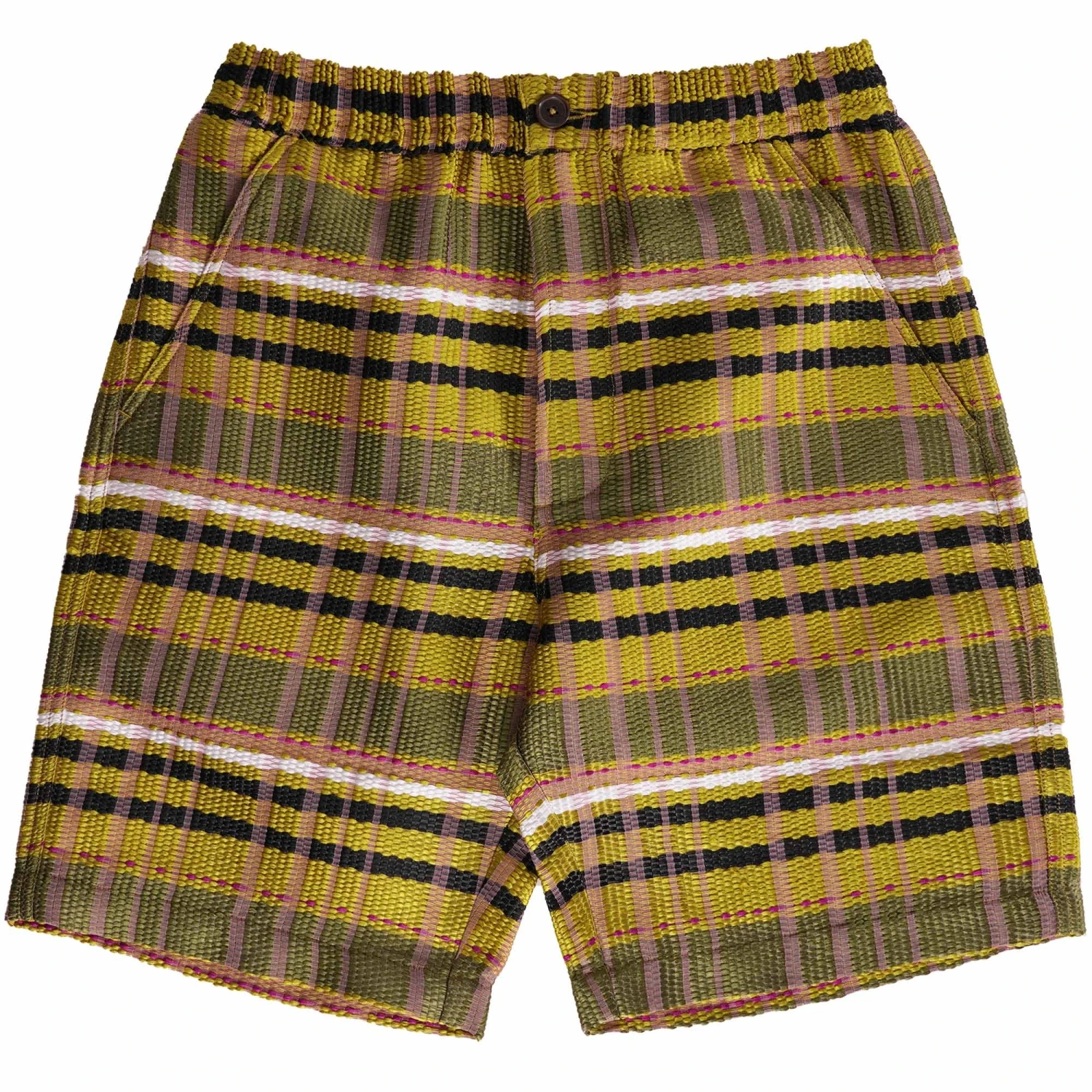 Universal Works introduces these Long Track Shorts featuring an all over stripe design, a zip and button closure, front side pockets and a buttoned back pocket.