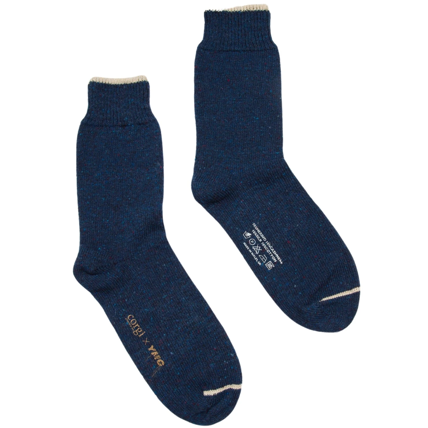 YMX and Corgi have teamed up to create these medium weight wool socks with a marled finish and contrast stripe trims. Crafted from 100% wool and feature ribbed cuffs.